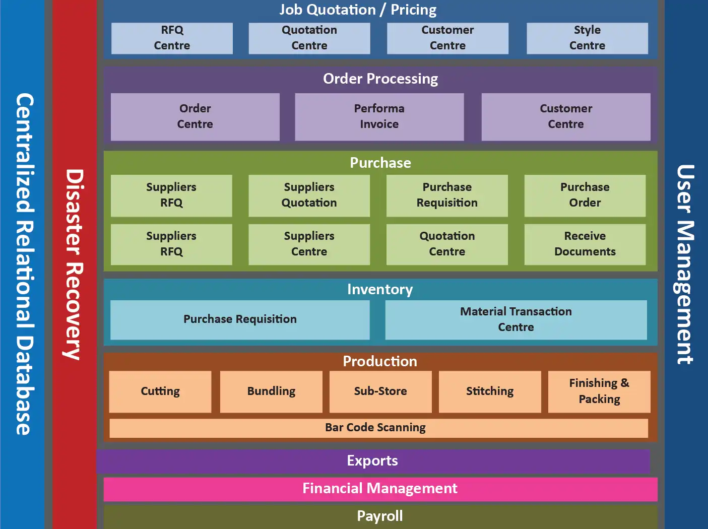 The Perahan efficiently controls the unique tasks confronting the garment and other similar industry. The tasks from taking orders for multiple styles, colors, and sizes, through the co-ordination of all resources required for production, to the tracking of dye lots and pieces of fabric are systematically performed.